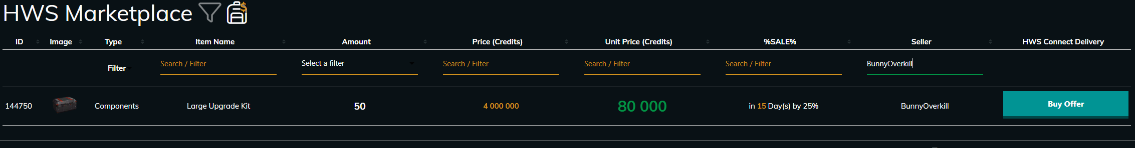=> Yesterday I put items into HWS marketplace (50x large upgrade kit), today, they are gone, nothing in dashboard log. The other items (50x advanced upgrade kit) were sold, and are logged. There is nothing about someone buying them, or incomming money for them, only that I have added them to marketplace.
